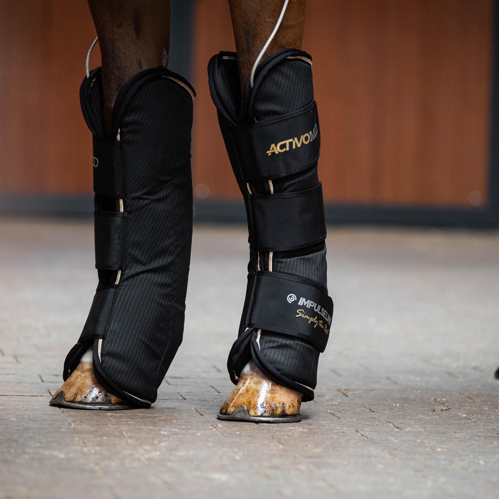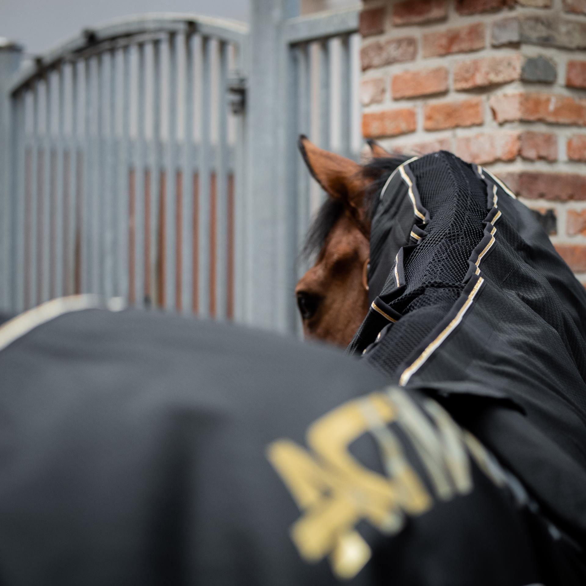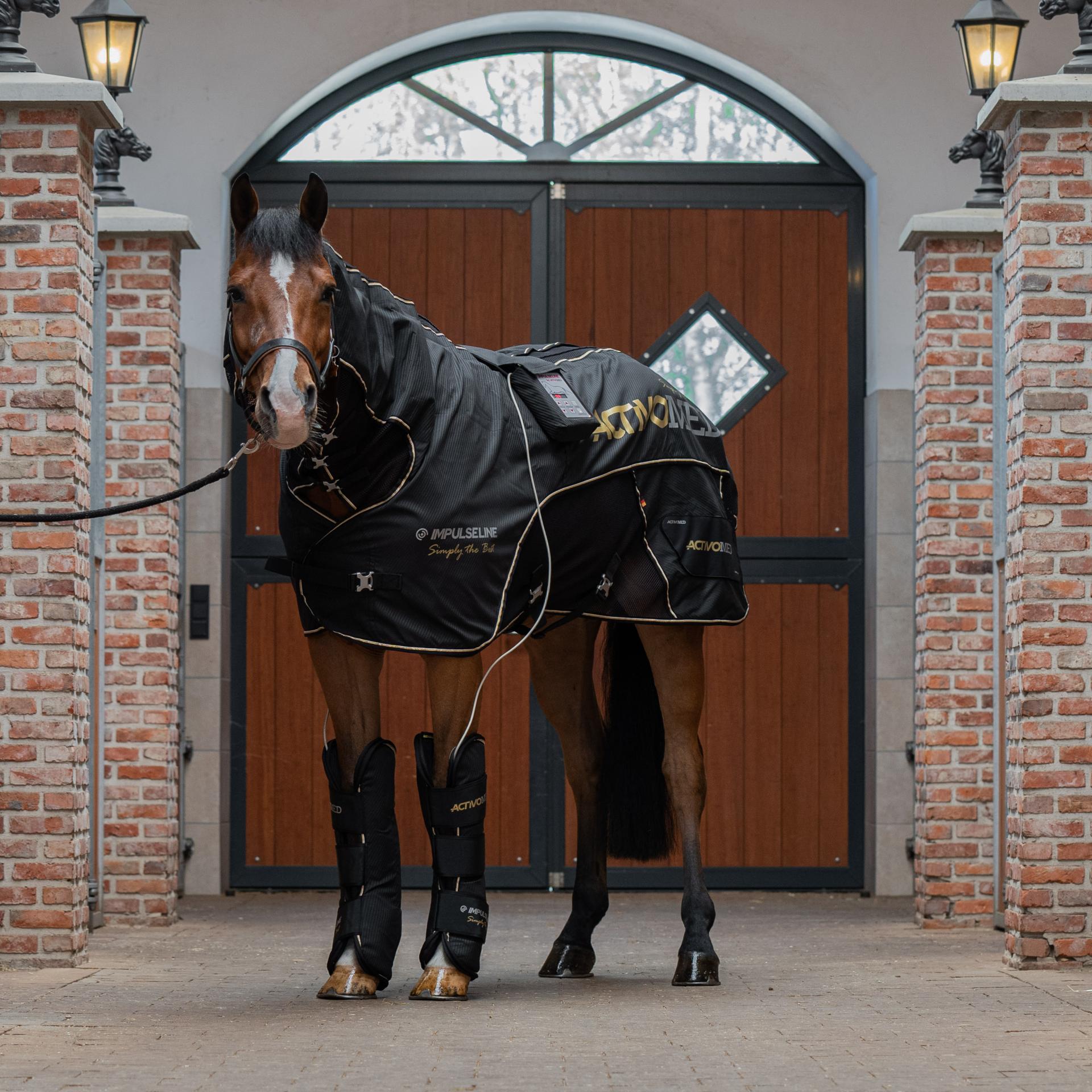 The IMPULSELINE Carbon horse rug is a PEMF therapy rug with neck and an additional massage function. This rug is outfitted with fourteen magnetic field coils/applicators on both sides of the spine, running from the poll over the shoulder to the croup and stifle. The inclusion of the shoulders and stifles allows for more targeted treatment of the whole horse.